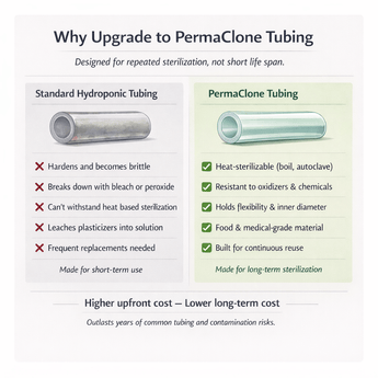 Unlike conventional vinyl, rubber, or low-grade silicone tubing, PermaClone Tubing is engineered for repeated sterilization cycles. It maintains flexibility, clarity, and dimensional stability even after exposure to heat, oxidizers, acids, bases, ozone, and UV—conditions that quickly harden, swell, or degrade standard hydroponic lines.